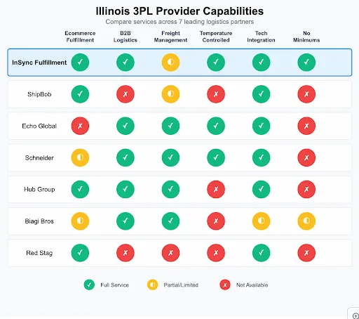 Choosing the right Illinois-based 3PL starts with knowing what you need. Whether it’s seamless ecommerce integration, multimodal freight efficiency, or specialized logistics support, each provider listed brings distinct strengths to the table.